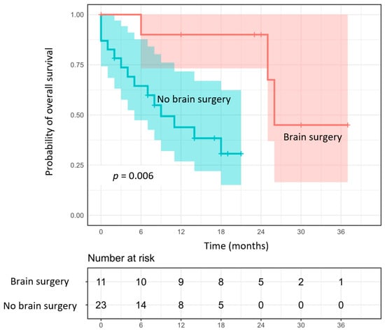 The median survival was 25 months, and the 1- and 2-year survival rates were 60% and 50% (Figure 2), respectively. Twenty-five (58%) patients succumbed to their extracranial disease and eleven (26%) to their brain disease. Based on the univariate analysis, KPS (p = 0.05), the performance of surgery before SRT2 (p = 0.006) (Figure 2), and a lower V25 in the normal brain, were associated with a better OS. After the multivariate analysis, only the performance of surgery was predictive of a significant survival benefit (p = 0.04; HR 6.8, 95% CI: 1.1–61.02) (Table S3).