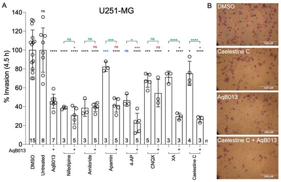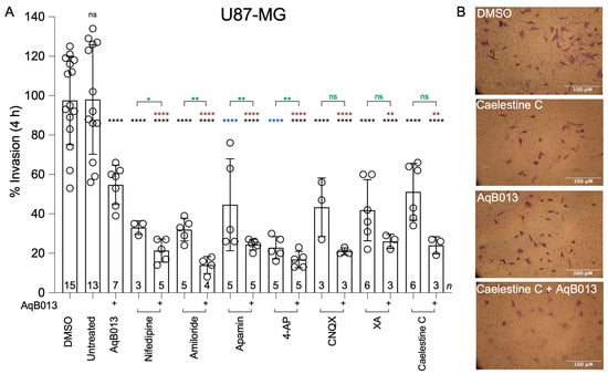Effects of pharmacological channel inhibitors and natural products on U87-MG invasion. (A) Compiled data in bar histograms show invasion standardized as a percentage to the mean values of vehicle or untreated controls. Statistical significance was determined with one-way ANOVA and Dunnett’s post-hoc tests. Statistically significant differences for individual agents with (+) and without AqB013 are shown in green. Differences between combined treatments and AqB013 alone are indicated in red. Differences between treatment groups and corresponding controls are indicated in black (vehicle) or blue (untreated). Doses of compounds were: AqB013 (14 μM); nifedipine (25 µM); amiloride (10 µM); apamin (10 µM); 4-AP (250 µM); CNQX (30 µM), XA (0.3 µM); caelestine C (0.1 µM). (B) Illustrative images are shown for stained U87-MG cells that traversed ECM-layered transwell filters by 4 h; in control (DMSO), caelestine C, AqB013, or combined AqB013 + caelestine C treatments (doses are the same as in (A)). p values less than 0.05 are summarized with one asterisk. p values less than 0.01 are summarized with two asterisks. p values less than 0.0001 are summarized with four asterisks.