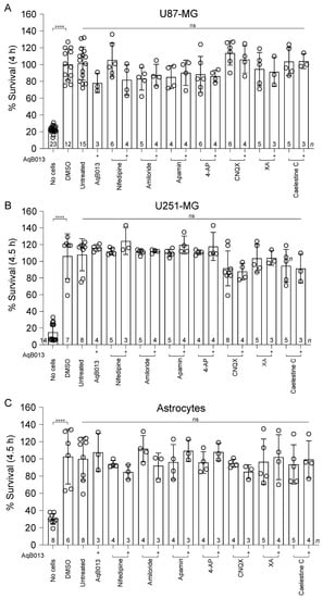 None of the pharmacological agents induced cytotoxicity in glioblastoma cells or astrocytes, as assessed by Alamar Blue assays (Figure 4) for conditions matching those used in transwell assays, confirming that impaired invasion did not result indirectly from a loss of cell viability.