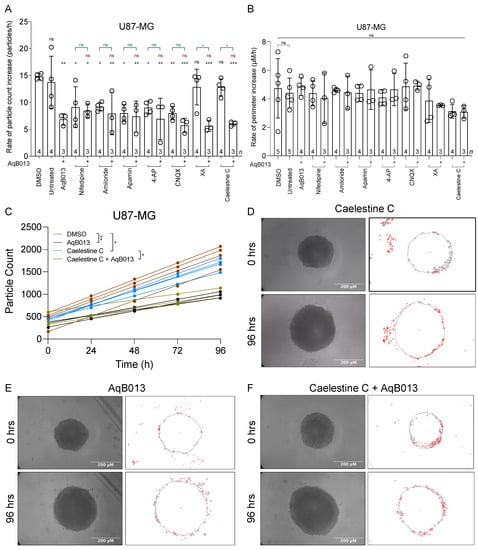 Inhibition of particle dispersal from U87-MG spheroid masses embedded in extracellular matrix, without loss of cell viability. (A) Bar histogram showing mean rates of particle dissemination (mean ± SD) from individual U87-MG spheroids in different treatments. Statistically significant results are represented by asterisks as *** p < 0.001, ** p < 0.01, * p < 0.05, and ns (not significant). (B) Growth rates (mean ± SD) measured as increased perimeter over time in different treatments. Statistically significant differences from control were assessed with one-way ANOVA and Dunnett’s post-hoc tests. (C) Total numbers of particles dispersed from individual spheroids as a function of time are shown for 0.2% DMSO (brown), 28 μM AqB013 (black), 0.2 µM caelestine C (blue), and combined application of 0.2 µM caelestine C and 28 μM AqB013 (khaki); n = 4 each. Fitted slope values provided the rates compiled in (A). Statistical significance was determined by repeated measures ANOVA with the Geisser-Greenhouse correction. (D–F) U87-MG spheroid perimeters measured at 0 and 96 h during treatments with (D) caelestine C (0.2 µM), (E) AqB013 (28 μM), or (F) the same doses of caelestine C and AqB013 in combination. No reductions in spheroid growth rates (perimeter lengths, shown as grey outline) were seen; in contrast decreased numbers of secondary nodes (red) were evident with AqB013.