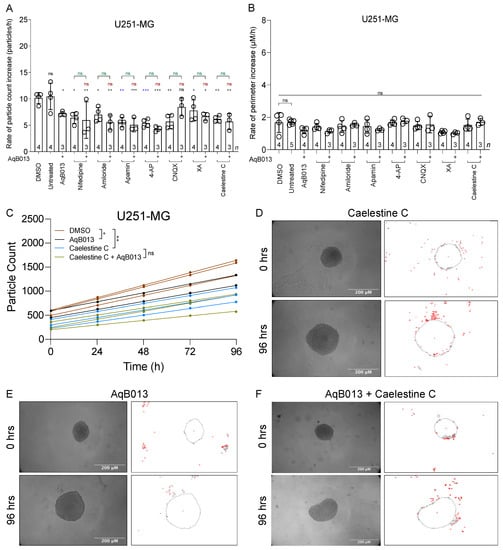 Inhibition of particle dispersal from U251-MG spheroid masses embedded in extracellular matrix, without loss of cell viability. (A) Effects of pharmacological agents on rates of particle dissemination from individual U251-MG spheroids (mean ± SD). Statistically significant results are represented by asterisks as *** p < 0.001, ** p < 0.01, * p < 0.05, and ns (not significant). (B) Rates of perimeter increases for individual U251-MG spheroids (mean ± SD) indicating growth in all treatments. Statistically significant differences from control were determined by one-way ANOVA with Dunnett’s post-hoc tests. (C) Total numbers of particles dispersed from individual U251-MG spheroids treated with 0.2 µM caelestine C and 28 μM AqB013 in combination (khaki), or AqB013 (black) or caelestine C (blue) alone at the same doses, as compared to DMSO control (brown), fit by linear regression. Statistical analyses used repeated measures ANOVA with the Geisser-Greenhouse correction. (D–F) Images of U251-MG spheroids at 0 and 96 h of treatments with (D) caelestine C (0.2 µM), (E) AqB013 (28 μM), or (F) both caelestine C + AqB013 (perimeters shown as grey outlines).
