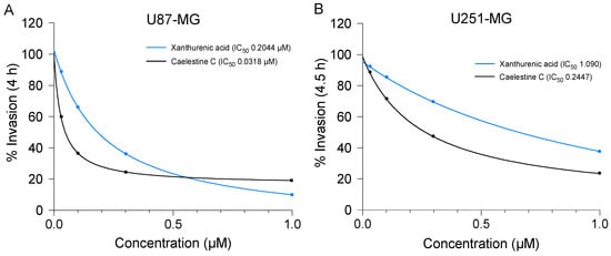 Potent inhibition of transwell invasion in glioblastoma cell lines by low-dose treatments with compounds linked glutamatergic receptor modulation. Dose-response curves show concentration-dependent inhibition of invasion for U87-MG (A) and U251-MG (B) in treatments with XA and caelestine C. Half-maximal inhibitory concentrations (IC50) were estimated by non-linear regression fits using GraphPad Prism software; values are listed in figure keys.