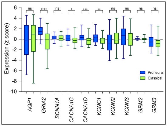 Transcript levels for channel targets of interest measured by RNAseq in human biopsy samples of proneural and classical glioblastoma subtypes. Transcript levels for aquaporin-1 (AQP1), AMPA glutamate receptor GluR2 (GRIA2), and selected ion channels (Epithelial Na+ channel (ENaC), SCNN1A; CaV1.2, CACNA1C; CaV1.3, CACNA1D; KV3.1, KCNC1; KCa2.3, KCNN3; KCa2.2, KCNN2; mGluR2, GRM2; and mGluR3, GRM3), were compiled from the GBM Bio Discovery Portal database. Z-scores for transcript levels in each patient reflect distance from the mean transcript level for the full population (n = 197) measured in standard deviations. Significant differences in transcript levels for each gene when comparing proneural (blue, n = 56) with classical (green, n = 53) subtypes were measured using unpaired t-tests with Welch’s correction. Statistically significant results are represented by asterisks as **** p < 0.0001, *** p < 0.001, ** p < 0.01, * p < 0.05, and ns (not significant).