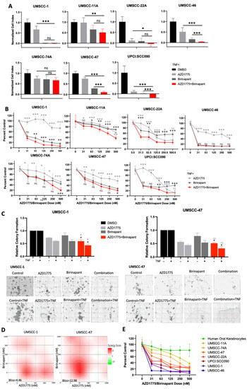 AZD1775 and birinapant combination treatment has therapeutic efficacy in HPV+ and HPV- HNSCC cells in the presence of TNF. (A) Impedance assay and (B) XTT viability analysis at 72 hrs after drug treatment, normalized to TNF control. AZD1775 and birinapant 100 nM with the exception of UMSCC-46, which has 2 nM birinapant and 500 nM AZD1775; TNF = 20 ng/mL, n = 6. Single outlier excluded from UMSCC-11A 500 nM AZD1775 group in XTT analysis. (C) Colony formation assay in UMSCC-1 and UMSCC-47. AZD1775 = 500 nM, birinapant = 500 nM, TNF = 20 ng/mL. n = 3. (D) Bliss Synergy scores according calculated using Synergyfinder software for AZD1775 and birinapant dose responses (0, 5, 10, 100, 500, 1000 nM) and TNF = 20 ng/mL. (E) XTT viability analysis with HOK cells compared to a panel of HNSCC cell lines; TNF = 20 ng/mL, n = 6. ns = not significant; * p < 0.05; ** p < 0.01; *** p < 0.001.