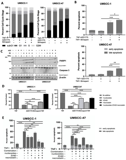 Combination treatment induces cell death in HNSCC through activation of multiple death pathways. (A) Cell cycle and (B) Annexin apoptosis assay analysis at 48 h after treatment. AZD1775/Birinapant = 100 nM, TNF = 20 ng/mL; n = 3. (C) Representative Western blot analysis of PARP and uncleaved/cleaved Caspase 3 expression following 48 h drug treatment. AZD1775 = 500 nM, birinapant = 500 nM, TNF = 20 ng/mL. β-actin was used as a loading control. (D) XTT viability assay at 72 h following simultaneous treatment with 500 nM AZD1775/Birinapant in the presence of 20 ng/mL TNF +/− 20 uM necrostatin, 20 uM Z-VAD-FMK, 1x nucleosides supplementation. n = 3. (E) Annexin apoptosis assay at 24 h following simultaneous treatment with 500 nM AZD1775/birinapant in the presence of 20 ng/mL TNF +/− 20 uM necrostatin, 20 uM Z-VAD-FMK, 1x nucleosides supplementation. n = 3. ns = not significant; * p < 0.05; ** p < 0.01; *** p < 0.001.