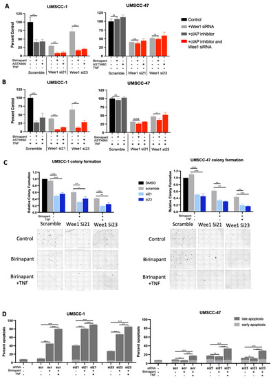Although AZD1775 is a well characterised WEE1 inhibitor, it has also been shown to inhibit WEE1 homologs and other G2/M kinases [36]. We therefore depleted WEE1 expression using two distinct siRNAs to determine if the combination effects observed were due to IAP and WEE1 activities. We confirmed WEE1 depeletion and a subsequent decrease in phosphorylated CDC2 in both UMSCC-1 and UMSCCC-47 after siRNA treatment (Supplementary Figure S3C). Next, cells treated with scramble siRNA or WEE1 siRNA were treated with birinapant or ASTX660, with or without TNFα. WEE1 depletion alone significanly reduced cell viability in both UMSCC-1 and UMSCC-47 cells and this was enhanced in the presence of TNFα, as we previously demonstrated [30]. The addition of either IAP inhibitor further reduced cell viability, which was again enhanced in the presence of TNFα (Figure 3A,B). These data were also confirmed used a colony formation assay, with the WEE1 siRNA/birinapant-combination-treated cells having a signifcant reduction in colony formation, which was further reducted in the presence of TNFα (Figure 3C). Finally, we confirmed that birinapant and WEE1 depeletion resulted in significant apoptosis upon TNFα addition, particularly in UMSCC-1 (Figure 3D). These results are consistent with the data produced using the WEE1 small molecule inhibitor, suggesting that the effects observed with AZD1775 are predominantly from WEE1 inhibition rather than off-target effects on other kinases.