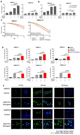Combination treatment radiosensitizes HNSCC cells via the induction of sustained DNA damage. (A) Annexin apoptosis assay at 24 post single-dose radiation with post radiation with a 1 h pretreatment of AZD1775/Birinapant; XRT = 4 Gy for UMSCC-47 and 6 Gy for UMSCC1. AZD1775/Birinapant = 500 nM. (B) Annexin apoptosis assay at 24 post single-dose radiation with a 1 h pretreatment of AZD1775/Birinapant; XRT = 4 Gy for UMSCC-47 and 6 Gy for UMSCC1. AZD1775/Birinapant = 500 nM. (C) Clonogenic survival assay with DMF score following 24 h treatment with AZD1775/Birinapant at 500 nM compared with DMSO control. Single-dose ionizing radiation was administered 1 h following AZD1775/Birinapant pretreatment in UMSCC-1 (XRT = 0, 4, 8, 12 Gy) and UMSCC-47 (XRT = 0, 2, 4, 6 Gy). (D) Flow cytometry analysis of γ-H2AX positivity in single drug or combination-treated cells with or without 20 ng/mL TNF, or radiation. Radiation was delivered following a 1 h pretreatment at 6 Gy for UMSCC-1 and 4 Gy in UMSCC-47. AZD1775/Birinapant = 500 nM, n = 3. (E) Immunofluorescence analysis of γ-H2AX foci formation over a time following radiation (UMSCC-1 = 6 Gy, UMSCC-47 = 4 Gy) with a 24 h drug pretreatment. Cells were analysed 30 min and 24 h post radiation treatment. Time 0 represents unirradiated cells. AZD1775/Birinapant= 500 nM. ns = not significant; * p < 0.05; ** p < 0.01; *** p < 0.001.