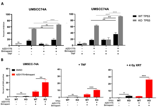 TP53 deficient HNSCC cells are more susceptible to combination therapy cytotoxicity and DNA damage. (A) XTT viability analysis in UMSCC74A TP53 WT and KO at 72 h normalized to DMSO control. AZD1775/Birinapant = 500 nM, TNF = 20 ng/mL. n = 3. (B) DNA damage according to γ-H2AX positivity on flow cytometry using CRISPR-Cas9 UMSCC-74A p53 KO and parental UMSCC-74A WT. 1 h pretreatment with drugs before 4 Gy radiation then analysis 24 h post treatment. AZD1775/Birinapant = 500 nM, TNF = 20 ng/mL. n = 3. ns = not significant; * p < 0.05; ** p < 0.01; *** p < 0.001.
