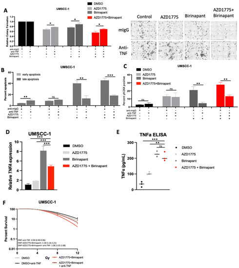 Combination treatment cytotoxicity in UMSCC-1 is at least partially TNF-driven. (A) Colony formation after 24 h of treatment with 500 nM AZD1775/Birinapant. Cells were pre-treated with control mouse IgG (1 μg/mL) or anti-TNF (1 μg/mL) for 4 h before treatment. n = 3. (B) Annexin apoptosis assay at 24 h with 500 nM AZD1775/Birinapant. Cells were pre-treated with control mouse IgG (1 μg/mL) or anti-TNF (1 μg/mL) for 4 h before treatment. n = 3. (C) Flow cytometry analysis of γ-H2AX positivity with 24 h of treatment with 500 nM AZD1775/Birinapant. Cells were pre-treated with control mouse IgG (1 μg/mL) or anti-TNF (1 μg/mL) for 4 h before treatment. n = 3. (D) qPCR analysis of TNF following treatment with indicated drug for 24 h, AZD1775/Birinapant = 500 nM, n = 3. U6 was used as a loading control. (E) ELISA assay of TNF protein expression following treatment with indicated drug for 24 h, AZD1775/Birinapant = 500 nM, n = 3. (F) Clonogenic survival assay with DMF score following 24 h treatment with AZD1775/Birinapant at 500 nM compared to DMSO control +/− anti-TNF (1 μg/mL). Single-dose ionizing radiation was administered 1 h following AZD1775/Birinapant pretreatment in UMSCC-1 (XRT= 0, 4, 8, 12 Gy) and UMSCC-47 (XRT = 0, 2, 4, 6 Gy). ns = not significant; * p < 0.05; ** p < 0.01; *** p < 0.001.