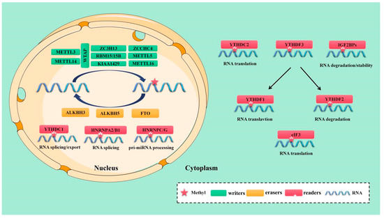 The m6A methyltransferase of RNA consists of “write in” proteins, including methyltransferase-like 3/5/14/16 (METTL3/5/14/16), the RNA binding motif protein 15/15B (RBM15/15B), Wilm’s tuner 1-associated protein (WTAP), Vir-like m6A methyltransferase-associated protein (VIRMA, also called KIAA1429), Zinc finger CCCH-type containing thirteen (ZC3H13) and Zinc finger CCHC-type containing four (ZCCHC4). The protein-based MTC is responsible for m6A installation [12] (Figure 1).