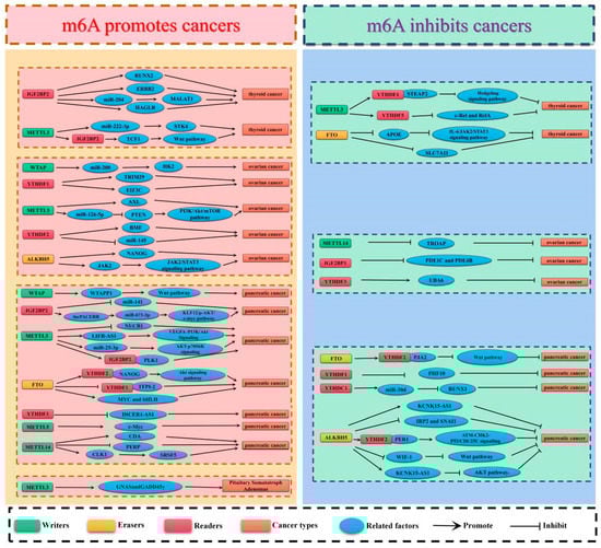 Thyroid carcinoma (TC) is the most prevalent endocrine-related malignancy. [57]. It is also the sixth most prevalent type of malignant tumor in the world, according to the 2020 Global Cancer Statistics [58]. The incidence rate increases by about 4% annually, accounting for 1% of all new cancers. Papillary thyroid carcinoma (PTC) is the main pathological subtype of TC [59], accounting for about 80–90% of all TC cases [60,61,62]. Most patients with TC have a good prognosis. Although PTC is well-differentiated, its biological performance is quite different. The inert thyroid micropapillary carcinoma shows a slow progression and rarely invades other tissues, whereas PTC shows lymph node or distant metastasis and has high mortality rates [63]. Recurrence and distant metastasis occur in about 30% of individuals, which negatively impacts patient prognosis [64,65]. Similar to other malignant tumors, the occurrence of TC is affected by environmental and genetic factors [66,67]. However, the exact molecular mechanism underlying the prevalence of TC remains elusive. Thus, understanding the role of m6A in TC is important to determine the most effective therapeutic strategy for TC (Table 1, Figure 2).