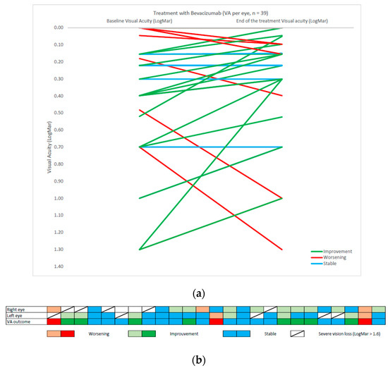 (a) VA graphical outcome per eye for 25 patients in baseline and after treatment with Bevacizumab: 39 evaluable eyes, monocular blindness excluded. (b) VA outcome represented with a column for each patient. Right and left eye evaluation and binocular outcome according to the graphical representation standardized by the SIOPE NF1 OPG workshop.