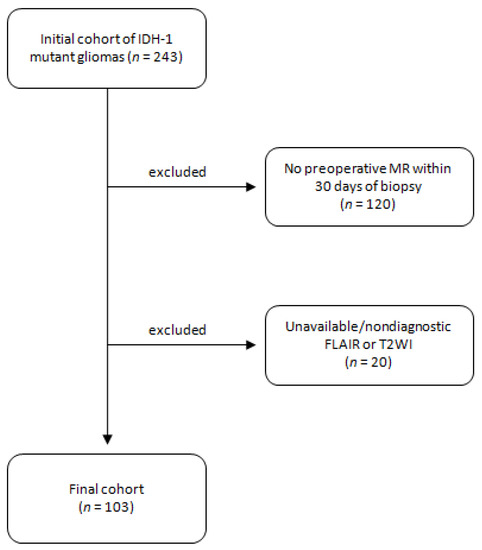 This retrospective study was approved by an institutional review board and informed consent was waived. Patients with initial diagnosis of gliomas between January 2016 to September 2018 were reviewed. Patients were included if they (1) had diagnosis of IDH1 mutant diffuse gliomas with known 1p/19q co-deletion status and (2) had preoperative MRI including T2WI and FLAIR within 30 days from the biopsy (Figure 1). 120 patients were excluded for not having preoperative MR within 30 days and an additional 20 patients were excluded for not having T2WI or FLAIR sequences. An external validation cohort was also included from an outside institution under an approved institutional review board. This cohort has identical inclusion and exclusion criteria.