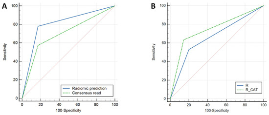 Receiver-operating characteristic (ROC) curves for prediction of 1p/19q co-deletion status. (A) Comparison of radiomics model to consensus T2-FLAIR mismatch with AUCs of 0.80 and 0.70, respectively (p = 0.044). (B) Comparison of radiologist T2-FLAIR mismatch alone to combined radiologist + radiomic (computer-assisted tool) with AUCs of 0.66 and 0.74, respectively (p = 0.019).