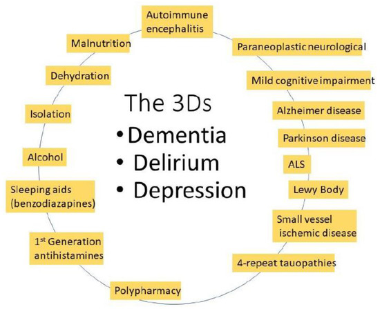 The diagnosis of cancers increases with age, to over 1000/100,000 (1%) in people over 60 [1]. In the UK, a third of new cancers are diagnosed in those over 75 years of age [2]. The median age of diagnosis for many cancers is also over 60 (Table 1). At the same time, the incidence of mild cognitive impairment (MCI), that typically does not interfere with daily life, in the US increases steadily over the age of 58, peaking in those > 80 years of age. Although memory loss and behavioral changes, dementia, delirium, and depression (the 3Ds, Figure 1) may be psychiatrically attributed to Alzheimer’s (AD) and Parkinson’s (PD) diseases [3], there are many other syndromes that present with similar symptoms [4].