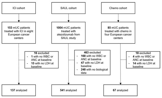 Flow diagram of the study population. ANC: absolute neutrophil count; Chemo: chemotherapy; ICI: Immune checkpoint inhibitor; LDH: lactate dehydrogenase; mUC: metastatic urothelial cancer; WBC: white blood cell.