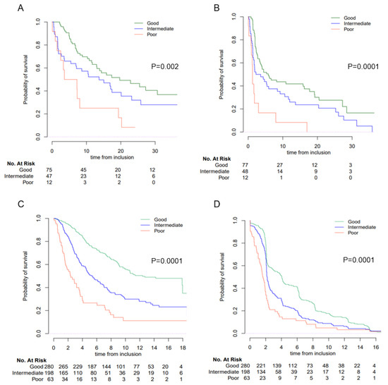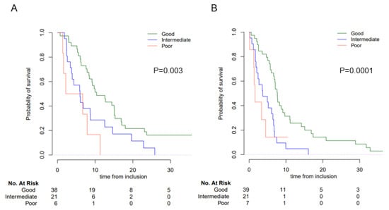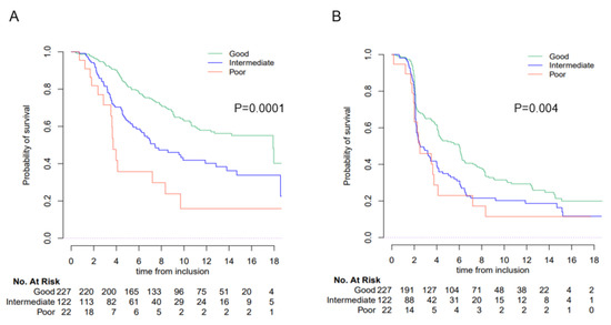 To explore whether the LIPI score provides any additional value to the Bellmunt score, we assessed the LIPI score in patients with good prognosis according to the Bellmunt score (score 0–1). The LIPI score identified patients with poor prognosis (Figure 4). Median OS was 17.9 mo (95% CI; 12.7–NR), 7.4 mo (95% CI; 6.1–12.8) and 3.7 mo (95% CI; 3.5–NR) for good, intermediate and poor LIPI groups, respectively (p < 0.0001). Median PFS was 6.0 (IC 95%; 4.2–6.2), 2.5 (IC 95%; 2.2–4.0) and 2.5 (IC 95%; 2.0–7.2) mo (p = 0.004) for good, intermediate and poor LIPI groups, respectively (Table 3).
