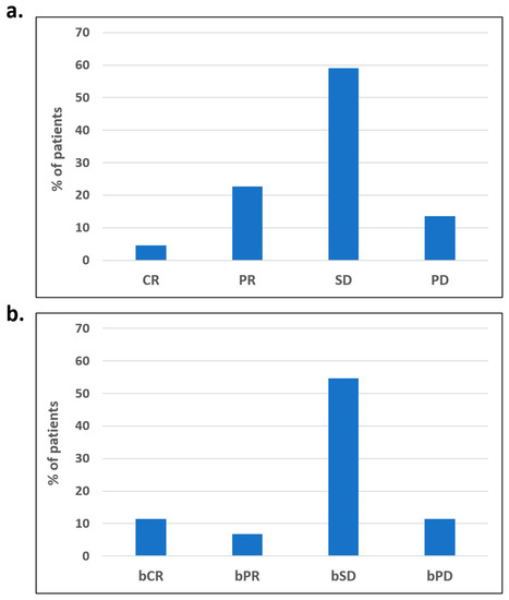 Analysis of responses. (a) Responses according to RECIST 1.1 criteria—CR—complete response; PR—partial response; SD—disease stabilization, PD—progressive disease. (b) Biochemical responses according to GCIG guidelines—bCR—biochemical complete response; bPR -biochemical partial response; pSD—biochemical stabilization; bPD—biochemical progression.