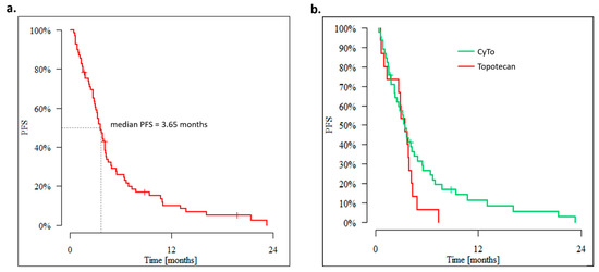 Progression-free survival (a) in the whole population; (b) in patients treated with single-agent topotecan and topotecan + cyclophosphamide (CyTo) combination.