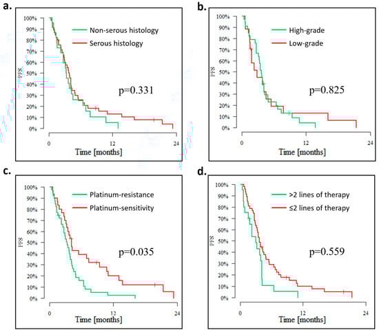 Progression-free survival (a) according to histology; (b) according to tumor grade; (c) according to platinum-sensitivity, (d) according to the number of lines of previous systemic treatment.