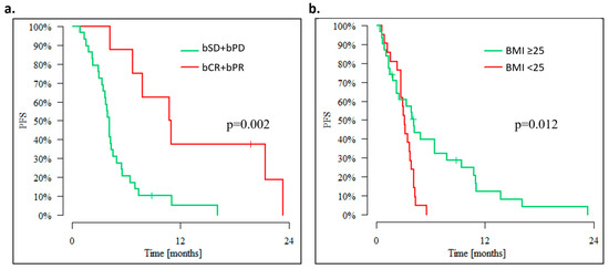 Progression-free survival according to (a) biochemical response, (b) BMI.