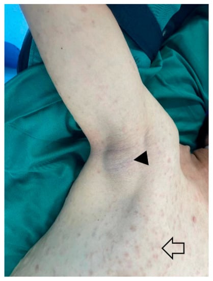 A 41-year-old male with Cafe-au-lait macules of NF1-associated with MPNST. The macules spread throughout the body (⇦), and MPNST is under the skin of the right axilla (▲).