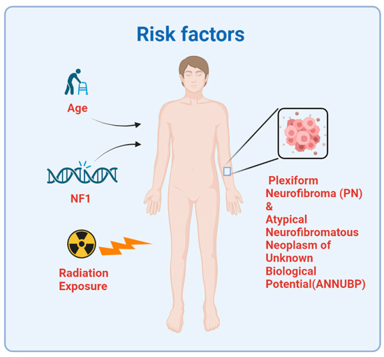 In summary, previous studies have found numerous risk factors associated with the onset of MPNST (Figure 2). NF1 is the most important factor in 50% of MPNST patients. The history of therapeutic irradiation can also increase the risk of MPSNT. Possession of PN and ANNUBP has malignant potential to cause MPNST development. Additionally, aging is an important risk factor because MPNST development takes a long time.