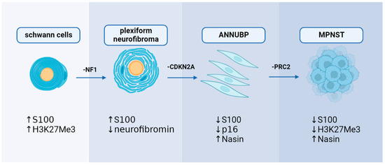 Significant breakthroughs have been made in understanding the genetic mechanisms of MPNST in the previous decade. Researchers now have access to more genetic data related to MPNST because of the application of genetic sequencing in clinical diagnosis. In the case of NF1-associated MPNST, sequential, multiple-hit genetic changes may eventually lead to the transformation of Schwann cells into precancerous lesions and MPNST. Knocking out the NF1 from the cell (NF1flox/flox embryos) and mouse (Nf1flox/flox; DhhCre) models has been found to cause PNs similar to those seen in humans [34]. Simultaneously, the NF1 mutation duplicates are significantly associated with the development of lesions [34]. However, only the loss of NF1 cannot result in the malignant transformation of PN to MPNST, suggesting that other genes are involved in developing MPNST [35]. Loss of CDKN2A is a common alteration of ANNUBP and MPNST, which is unrelated to NF1-associated or sporadic causes [36,37]. The transition to the premalignant state is driven by the extent of CDKN2A/B deficiency [38]. A haploid mutation can lead to atypical neurofibroma, and the homozygous deletion is defined as ANNUBP [38]. Conditional ablation of NF1 and CDKN2A in the Schwann cell lineage results in ANNUBP and can progress to MPNST in the Postn-Cre Nf1flox/flox Arfflox/flox mouse model [39]. Function loss of polycomb repressive complex 2 (PRC2) is also associated with MPNST. Lee et al. found that dysfunction of PRC2 occurs in 70% of NF1-associated MPNST, 92% of sporadic MPNST, and 90% of radiotherapy-associated MPNST [17]. EED and SUZ12 are the core components of PRC2, which work together to methylate Lys27 of histone H3 to produce H3K27Me3, which can inhibit nerve repair genes [40]. Almost 80% of MPNST exhibited EED or SUZ12 deletion, resulting in the loss of PRC2 function and leading to H3K27Me3 global hypomethylation [17]. Researchers transferred wild type SUZ12 or EED into the MPNST cell line ST88-14 (which has lost H3K27Me3) to investigate the association between PRC2 and MPNST. After SUZ12 transfer, H3K27me3 levels recovered, and cell growth was significantly reduced [17]. Ma et al. found that EED knockdown can cause epigenetic changes by reducing H3K27me3; however, this effect was inhibited by the induction of CDKN2A. It is speculated that the co-mutation of PRC2 encoding genes and CDKN2A resulted in the progression of benign neurofibroma to MPNST [41]. The present findings suggest that mutations in NF1, CDKN2A, and genes encoding PRC2 complex proteins may play a synergistic role in the development of MPNST, particularly NF1-associated MPNST. Furthermore, the mutation order may also coordinate with the biomarker changes (Figure 3).