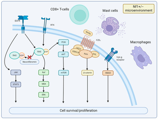 The cellular signaling pathways of MPNST and the tumor microenvironment are important areas of future research. Particularly, alterations in the NF1 gene can result in abnormal activation of the RAS pathway, which can promote cell proliferation via the downstream RAF-MEK-ERK (MAPK) and PI3K-AKT-mTOR pathways. MEK is significantly activated in MPNST [48], and clinical evidence demonstrates that MEK inhibitors are significantly effective in PN [49] and MPNST [50]. The mTOR signaling pathway regulates cell growth, survival, proliferation, cytoskeletal organization, and autophagy [51]. Biplab Dasgupta et al. first reported that mTOR signaling is significantly activated in NF1-knockout cells and animals and that the rapamycin (mTOR inhibitor) can inhibit NF1-related tumor growth [15]. Johansson et al. found that everolimus inhibits the growth of 19–60% of NF1-associated or sporadic MPNST cell lines [52]; however, it is ineffective in clinical trials [53]. Wnt/β-catenin signaling is strongly associated with various human cancers [54]. A study showed that the gene expression of 20 components or regulators of the Wnt pathway are altered in MPNST compared to benign neurofibromas [55]. However, the precise role of the Wnt pathway in MPNST is still undetermined. Other signaling pathways including neuregulin-1/ErbB [56] and EGFR–STAT3 [57], which have also been reported in MPNST studies. In the MPNST microenvironment, an interesting finding is that the NF1+/− microenvironment may contribute to neurofibroma development [58]. It is possibly due to the alteration in immune cells, such as CD8+ T cells and natural killer cells, compared to wild-type counterparts [59]. NF1-heterozygous mast cells were also found to be activated by c-kit signaling and to promote tumor cell growth by releasing TGF-β [60], which leads to related clinical studies of tyrosine kinase receptors targeting KIT receptors [61]. Others, such as macrophages, are also involved in tumor formation [62]. Together, the alterations in cellular signaling pathways and the NF1+/− microenvironment promote cell survival and proliferation of MPNST (Figure 4).