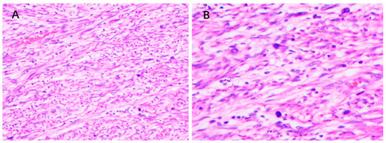 There is no defined subset of MPNST markers for pathological analysis. A specific pathological criterion for MPNST, particularly sporadic MPNST, is lacking due to the heterogeneity of gene mutation loci and immunohistochemical manifestations. Therefore, distinguishing it from other soft tissue sarcomas is challenging. Currently, MPNST diagnosis is primarily based on exclusion. MPNST is a tumor of nerve origin, usually attached to a nerve trunk, is white, solid, fleshy, and sometimes has myxoid changes. The main distinction is to rule out other nerve tumors. Microscopically, the MPNST can have a variety of morphologies, and as a result it is often classified into distinct subtypes [80]. MPNST has elongated, cusped, curved, or wavy nuclei with scant cytoplasm. The nucleus can be hyperchromatic or vesicular, with coarse chromatin in the latter, and the cells tend to be obtuse and pointed, typical features of neurilemmal differentiated cells (Figure 5). Furthermore, cell necrosis, mitosis, and hemorrhage are common pathological changes in MPNST [80]. In general, these findings are nonspecific and cannot be used to diagnose MPNST, but they are helpful in the differential diagnosis. For example, diffuse cellularity and conspicuous mitoses may ensure the differentiation of MPNST from atypical neurofibroma and nonneurogenic tumors [81].