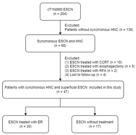 Flowchart of the study. Abbreviations: ESCN, esophageal squamous cell neoplasm; HNC, head and neck cancer; CCRT, concurrent chemoradiotherapy: RFA, radiofrequency ablation; ER, endoscopic resection.