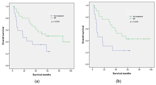 The Kaplan–Meier survival curves for OS are presented in Figure 2. During the study period, OS was significantly better in the ER group (p = 0.044, Figure 2a). In the subgroup analysis of patients with advanced-stage HNC, OS was also significantly better in the ER group (p = 0.045, Figure 2b).