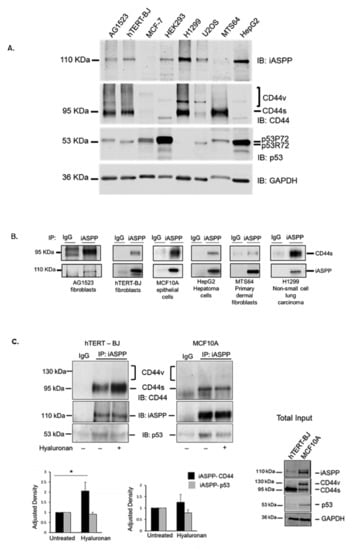 CD44s forms physical complexes with iASPP, both in mesenchymal and epithelial cells. (A) The expression levels of CD44, iASPP, and p53 were analysed in cell lysates from AG1523 fibroblasts, hTERT-BJ foreskin fibroblasts, breast cancer cells MCF-7, HEK293, lung carcinoma H1299, sarcoma U2OS, human dermal fibroblasts MTS64, and hepatoma HepG2 cells by immunoblotting (IB) with indicated antibodies, using anti-GAPDH as loading control. (B) Cell lysates from the selected cell lines were subjected to immunoprecipitation with an iASPP antibody or 3 µg/mL control rabbit IgG, followed by immunoblotting for CD44 and iASPP. (C) hTERT-BJ fibroblasts and MCF10A cells were cultured for 24 h in starvation medium prior stimulation, or not, with hyaluronan for 45 min. Cell lysates were then subjected to immunoprecipitation, using an iASPP antibody or control rabbit IgG, followed by immunoblotting with CD44, iASPP, and p53 antibodies. Note the absence of co-immunoprecipitated band at the expected position of CD44v just above the CD44s band. A representative experiment out of three performed is shown; lower panel in C indicates fold-change of mean values ± SD. of three independent experiments: * p < 0.05, Student’s t-test; significant difference compared with unstimulated cells. The uncropped blots are shown in File S1.