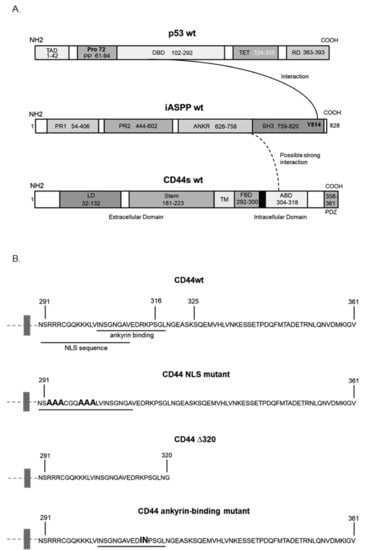 Schematic illustration of the structures of p53, iASPP, and CD44, and CD44 mutants. (A) An established interaction between domains in p53 and iASPP is indicated by a line, and the interaction found in the present study between iASPP and CD44s is indicated with a dashed line. (B) The cytosolic sequence of CD44 and the mutants used in this study are indicated.