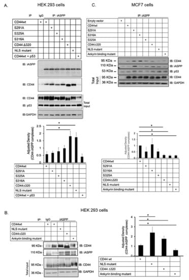 CD44 ankyrin-binding domain interacts with iASPP. (A,C). Wt CD44 and CD44s with mutated phosphorylation sites, ankyrin-binding domain and nuclear localization sequence, as well as a CD44 Δ320 deletion mutant, were transiently transfected in HEK293 cells (A,B) or MCF-7 cells (C). Cell lysates were subjected to immunoblotting using the indicated antibodies. Quantifications are shown below panels A and C, and to the right of panel B. The data are plotted in bar graphs representing the mean ± SD of at least three independent experiments (* p < 0.05, Student’s t-test). The uncropped blots are shown in File S1.