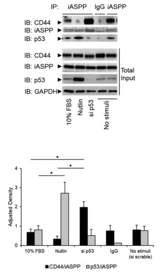 p53 expression levels modulate formation of the complex between iASPP and CD44. hTERT-BJ cells, treated with p53 siRNA, or not, were stimulated with 10% FBS or 10 nM Nutlin. Lysates were subjected to immunoprecipitation (IP) with an iASPP antiserum, followed by immunoblotting with antibodies against iASPP and p53. Quantification of the data is shown below the blot. The data are plotted in bar graphs representing the mean ± SD of at least three independent experiments (* p < 0.05, Student’s t-test). The uncropped blots are shown in File S1.