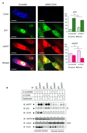 Depletion of CD44 promotes the translocation of p53 and iASPP to the cytoplasm. (A) hTERT-BJ cells treated with CD44 siRNA, or not, were stained for CD44 (blue), p53 (green), or iASPP (red). Images were taken using a Zeiss Axioplan 2 immunofluorescence microscope with a 63× objective. By ImageJ software, the localizations of p53 and iASPP in cytosol and nuclei were measured and are shown in the panels to the right. Scale bars, 10 µm. * p < 0.05, Student´s t-test. (B) Subcellular fractionation was performed on untreated or hyaluronan-stimulated hTERT-BJ cells transfected with siRNA for CD44 or scramble siRNA as control. Cell lysates were then immunoprecipitated with an iASPP antibody, followed by immunoblotting with iASPP, p53, and CD44 antibodies. The purity of the nuclear and cytoplasmic fractions was determined by immunoblotting for laminin and GAPDH, respectively. A representative experiment out of three independent experiments performed is shown. The data are plotted in bar graphs representing the mean ± SD of at least three independent experiments (* p < 0.05, Student’s t-test). The uncropped blots are shown in File S1.