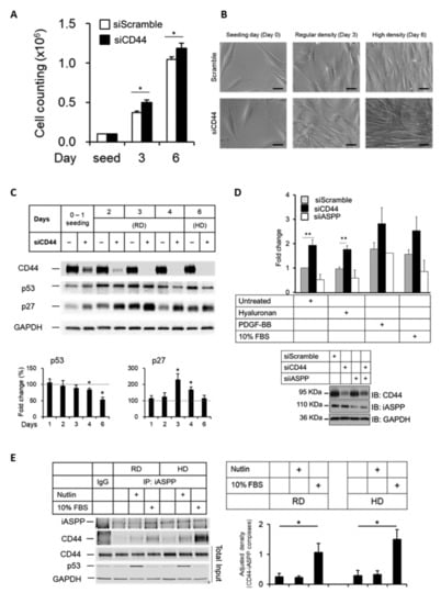 Knock-down of CD44 in AG1523 fibroblast leads to loss of contact inhibition. (A,B) AG1523 fibroblasts, transfected with CD44 siRNA or scramble siRNA, were seeded in 6-well plates and grown to a density of 105 cells per well (regular density; RD) or >106 cells per well (high density; HD), counted, and observed under microscopy. Scale bars, 20 µm. (C) Cell lysates from RD and HD cell cultures were subjected to immunoblotting using indicated antibodies. (D) AG1523 cells, treated with CD44 siRNA, iASPP siRNA, or scramble siRNA, were stimulated, or not, with hyaluronan, PDGF-BB, and 10% FBS, and then subjected to a 3H-thymidine incorporation assay. Knock-down efficiencies are shown in immunoblots. (E) Cell lysates from RD and HD cell cultures, incubated in Nutlin or 10% FBS, were subjected to immunoprecipitation using an iASPP antibody, followed by immunoblotting using indicated antibodies. The data are plotted in bar graphs representing the mean ± SD of at least three independent experiments (* p < 0.05 and ** p < 0.01, Student’s t-test). The uncropped blots are shown in File S1.