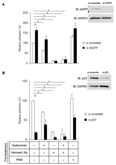 iASPP suppresses but p53 increases CD44-mediated adhesion of fibroblasts. (A,B) AG1523 fibroblasts incubated with iASPP siRNA (A), p53 siRNA (B), or scramble siRNA, were pre-treated, or not, with hyaluronan and blocking CD44 antibody or PMA and then seeded (30,000 cells per well) and incubated for 30 min. Adhered cells were then visualized by staining with crystal violet and quantified by measurement of the absorbance at 570 nm. The data are plotted in bar graphs representing the mean ± SD of at least three independent experiments (* p < 0.05, Student’s t-test). The uncropped blots are shown in File S1.