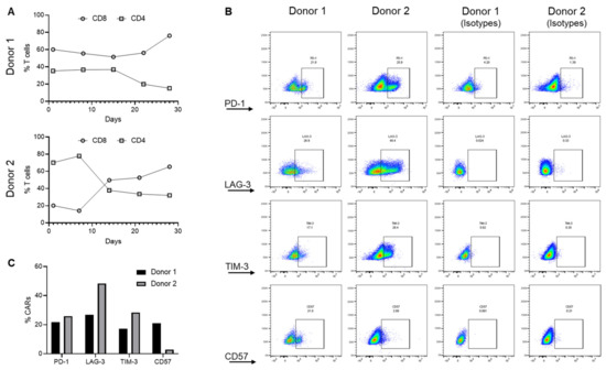 Donor lineage skewing and the expression of exhaustion markers. (A) Changes in CD8 and CD4 cells during ex vivo expansion of EGFRvIII CAR T cells. (B,C) Expression of T cell exhaustion (PD-1, TIM3, and LAG3) and senescence (CD57) markers on CAR T cells. These data summarize the analysis generated from two different donors (Donor 1 and Donor 2) and are representative of a triplicate analysis.