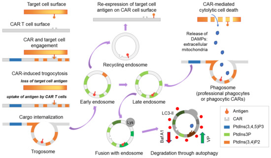 Scheme demonstrating CAR-induced trogocytosis. Trogocytosis occurs upon CAR-target engagement resulting in the expression of the target tumor antigen on CAR T cells. Following extraction by CAR T cells, the tumor antigen is internalized and processed through the endosome system and then is either recycled to the cell surface or shuttled to late endosomes and subsequently degraded through lysosome and autophagy-dependent mechanisms. Activation and inhibition of autophagy may regulate trogocytosis and modulate CAR T cell function. In addition, trogocytosis may interface with phagocytosis. Baf A1, bafilomycin A1, an inhibitor of vacuolar ATPase and autophagy; VP, verteporfin, an activator of selective autophagy; DAMPs, damage-associated molecular patterns.