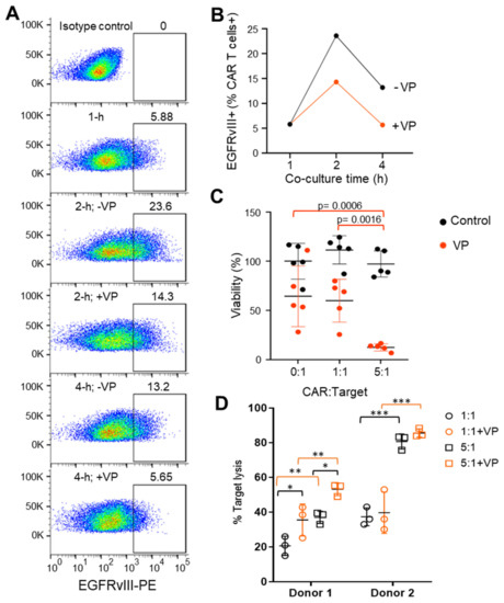 Verteporfin inhibits CAR-induced trogocytosis and increases CAR activity. (A) Representative flow cytometry example of EGFRvIII expression on Donor 1 CAR prior to or following co-culture with targets (U87-EGFRvIII) in the absence (-) or presence (+) of verteporfin (VP). The gate is set against the isotype control and was conducted in triplicate. (B) Summarized kinetic data from A of CAR T cell EGFRvIII expression in the absence and presence of VP. (C) Target (U87-EGFRvIII) cell viability treated with Donor 1 CARs in the absence (control; black circles) or presence of verteporfin (VP; red circles) for 24 h. A Two-way ANOVA test and Turkey’s multiple comparisons were conducted with no statistical significance between the control groups (black circles). Statistical significance between the VP-treated groups (red circles): p = 0.0006 (0:1 vs. 5:1), p = 0.0016 (1:1 vs. 5:1). (D) CAR-mediated lysis of target (U87-EGFRvIII) cells treated with EGFRvIII CARs derived from Donor 1 and Donor 2 at 1:1 and 5:1 ratio in the absence (-VP) or presence (+VP) of verteporfin for 24 h. * p < 0.05; ** p < 0.01; *** p < 0.001 (unpaired t-test). For Donor 1: p = 0.039 (1:1 vs. 1:1+VP), p = 0.0312 (5:1 vs. 5:1+VP), p = 0.0145 (1:1 vs. 5:1), p = 0.0117 (1:1+VP vs. 5:1+VP). For Donor 2: not significant (1:1 vs. 1:1+VP), not significant (5:1 vs. 5:1+VP), p = 0.0001 (1:1 vs. 5:1), p = 0.0001 (1:1+VP vs. 5:1+VP).