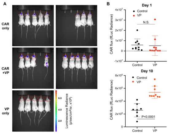 To improve CAR persistence in the GBM tumor microenvironment, we sought to determine whether autophagy counters trogocytosis in vivo. We first assayed the abundance of CAR T cells in the brain of U87-EGFRvIII tumor-bearing mice treated with or without verteporfin. The bioluminescence (BLI) CAR T cell signal was only detected in CAR-infused tumors (Figure 7A). Although there was no significant difference in CAR retention noted one day after infusion, verteporfin-treated mice maintained significantly higher levels of CAR signal ten days after infusion (Figure 7B; p < 0.0001).