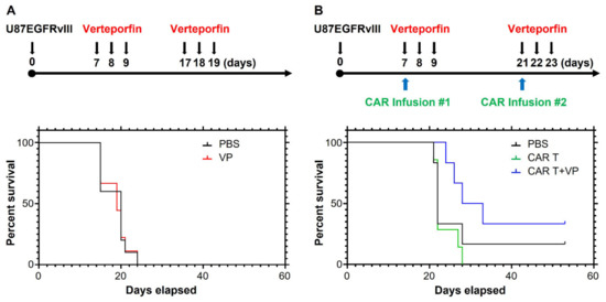 Verteporfin reverses CAR dysfunction. (A) Treatment schema and survival curves of mice bearing U87-EGFRvII tumor treated with or without verteporfin, median survival 17 days (PBS and VP). (B) Treatment schema and survival curves of mice bearing U87-EGFRvIII tumors treated with Donor 1 CAR with or without verteporfin, median survival 22 (PBS), 22 (CAR T), and 30.5 days (CAR T+VP). If the mouse was moribund or dead, it did not receive the second CAR treatment.