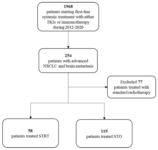 Of the 1968 aNSCLC patients who started a first-line systemic treatment with either TKIs or pembrolizumab during the study period, 254 had signs of brain metastases within 120 days around the diagnosis. Of these, 77 patients received standard RT and were therefore excluded from the analysis. The final cohort included 177 patients, of whom 58 were treated with STRT and 119 were treated with STO (Figure 1).