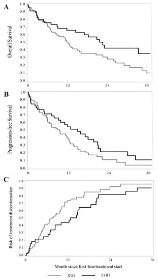 Kaplan–Meier estimates of overall survival (A), progression-free survival (B), and time-to-treatment failure (C) among patients with advanced NSCLC and synchronous brain metastasis treated with systemic therapy and advanced radiotherapy (STRT) or with systemic therapy only (STO). Footnote: In order to avoid immortal-time bias, in this analysis, only patients who survived to the first three months of follow-up were included. For each patient, follow-up starts three months after the start of first-line systemic therapy.