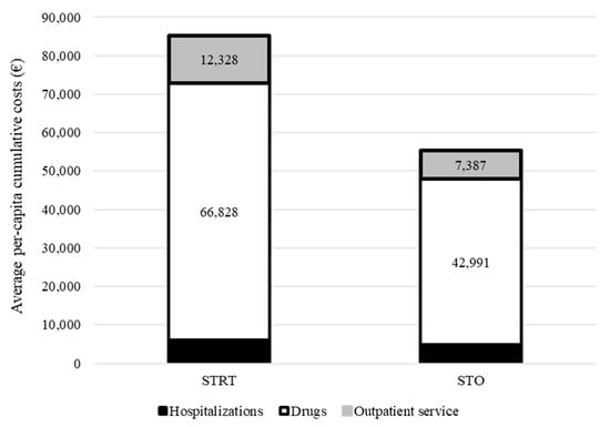 Comparison between cumulative per capita healthcare costs sustained by the National Health Service for taking care of patients with advanced NSCLC and synchronous brain metastasis treated with systemic therapy and advanced radiotherapy (STRT) or with systemic therapy only (STO). Footnotes. In this analysis, only 46 patients treated with STRT and 66 patients treated with STO who survived to the first three months of follow-up were included. For each patient, follow-up starts three months after the start of first-line systemic therapy.