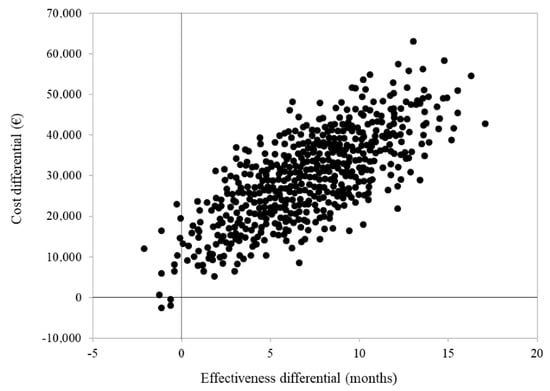 Cumulative healthcare costs by treatment group are shown in Figure 3. Overall, EUR 85,273 and EUR 55,316 were spent, on average, for each patient treated with STRT or systemic therapy alone, respectively. The cost-effectiveness profile is shown in Figure 4. The ICER (incremental cost-effectiveness ratio) value indicated an average cost of EUR 3792 for each month of survival after STRT treatment and confirmed clinical effectiveness (i.e., longer survival for patients on STRT therapy than systemic therapy alone), but higher healthcare costs.