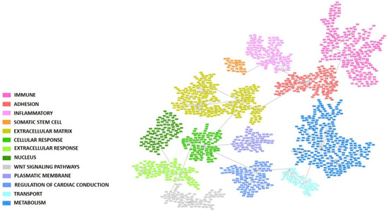 A PGM was built with the gene expression profiles of the 1700 more variable genes. Seeking functional structures, 13 functional nodes with an overrepresented biological function were defined: immune, adhesion, inflammatory response, somatic stem cell, extracellular matrix, cellular response, extracellular response, nucleus, Wnt signaling pathway, plasmatic membrane, regulation of cardiac conduction, transport, and metabolism (Figure 1 and Supplementary Table S2).