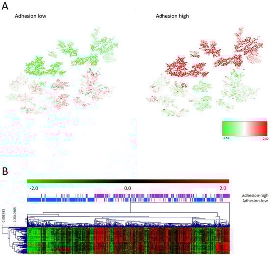 In order to perform a deeper characterization, differences between high- and low-adhesion groups were evaluated by functional node activity, as defined by the PGM (Supplementary Figure S2). The high-adhesion group had higher activity of adhesion, immune response, inflammatory response, stem cell, and extracellular matrix functional nodes. Meanwhile, the low-adhesion group presented higher activity of Wnt signaling pathway, plasmatic membrane, transport, metabolism, and regulation of cardiac conduction functional nodes.